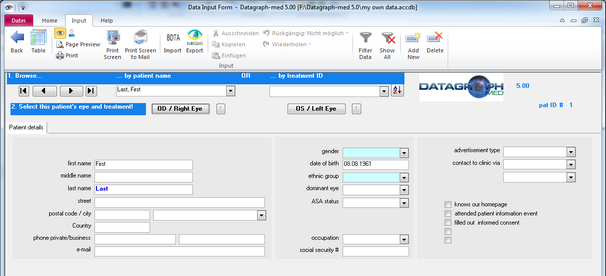 After clicking OK the actual data input form appears. Enter more patient data if available and then proceed entering data for OD or OS by clicking the appropriate button.