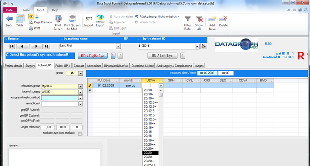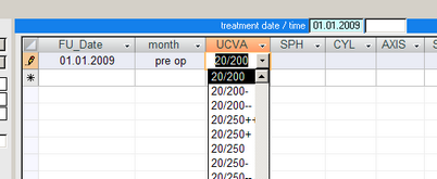 Click OK to open the form and add follow up data. Drop down lists for visual acuity can be used. The VA type can be changed in default settings.