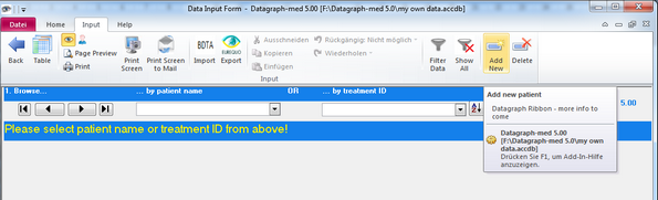To file a new patient you either click on the 'add new' icon or select the '--- add new patient ---' line in the drop down list under '...by patient name'.