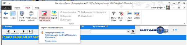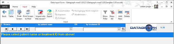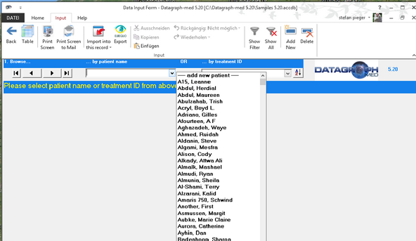 In case there are no entries yet in your database you will see 'add new patient' on the drop down list which starts the filing of a new patient.