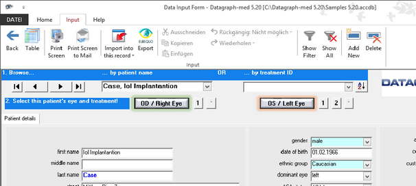 Browsing by patient will open the 'patient details'. You may add or edit examination data for the right and left eye individually by clicking on the OD/OS buttons.