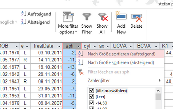 Please note that by default only preOP values are displayed. Use the filter settings icons on the icon bar, to include follow up data to the table for example. 'Filter on current selection'; 'Filter excluding current selection'; 'Filter by form' (not available in Runtime Installations!); 'apply Filter by form' and 'remove Filter'. Filters are an elegant way to reduce the amount of data displayed. Place the cursor in any of the fields in the data entry form and click on the 'More filter options' icon --> only data with the current field value will be displayed. Note you can apply this filter more than once. For example - fist click place the cursor on 'Myo' in the refr. Group field and click on the filter button --> only your myopic cases will be displayed. Then place the cursor in 'eye' field and click again - only Left (or Right) eyes of myopic patients will be displayed.
