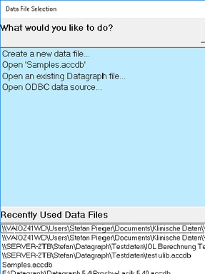 Select 'Open Samples.accdb' in order to make yourself familiar with Datagraph using sample data.