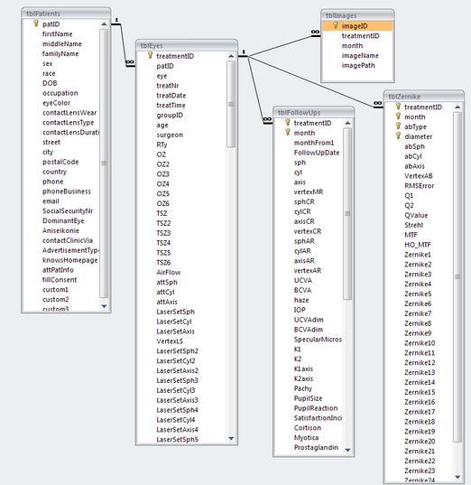 Datagraph-med uses the relational database software from Microsoft, called 'Access'. 'Relational' means, that data is stored in several tables which are linked to each other, using certain 'index fields'. These tables keep general patient data sperate from follow up data or Zernike wavefront data for example. The advantage of a relational database system is, that data is stored more compact than in one huge excel spread sheet. Follow up data fields are added to your database only at the moment data is entered. The relational database structure also helps to avoid collecting redundant data.