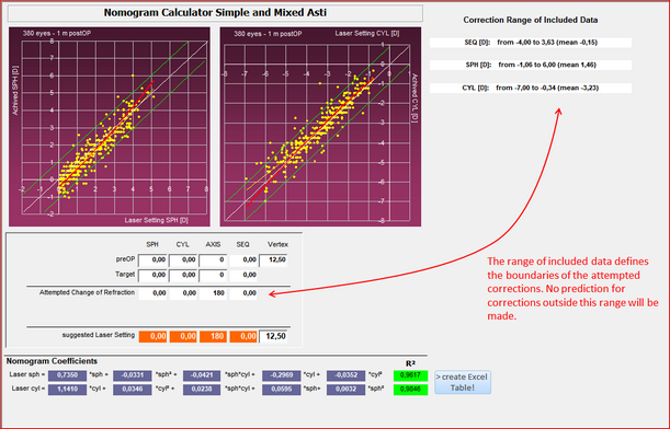 The Nomogram Calculator allows you to enter preOP and target refractions including vertex distance and then automatically calculated the suggested laser settings for sph, cyl and axis. You may enter preOp refractions in plus or minus cylinder notation as the attempted refraction will be automatically converted to minus cylinder.